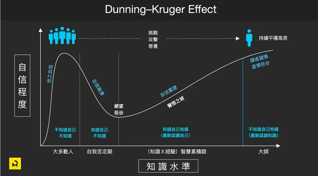 直到一個人開始意識到自身的不足,就步入「自信崩潰」階段,這往往是職涯發展的一個轉折點。在這個階段,人們會開始積極尋求知識與技能的提升,這是通往成熟專業人士必經的路徑。當一個人達到「自信重建」的階段,他們對自己的能力有了更加清晰和客觀的認識,就能夠更有智慧地規劃自己的學涯道路。