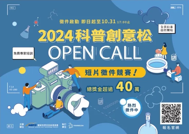 國家科學及技術委員會為深化科普傳播效益及培養下一代科普人才,辦理第二屆「Open Call科普創意松」短片徵件競賽及業師培力等系列活動,旨在鼓勵學生運用科學思維,創作科學創意影片、短影音,並藉由作品交流與業師培訓機制,輔導學生強化影片製作技巧、掌握數位影音趨勢,實現科普教育深耕校園與全民提升科學素養之目標。