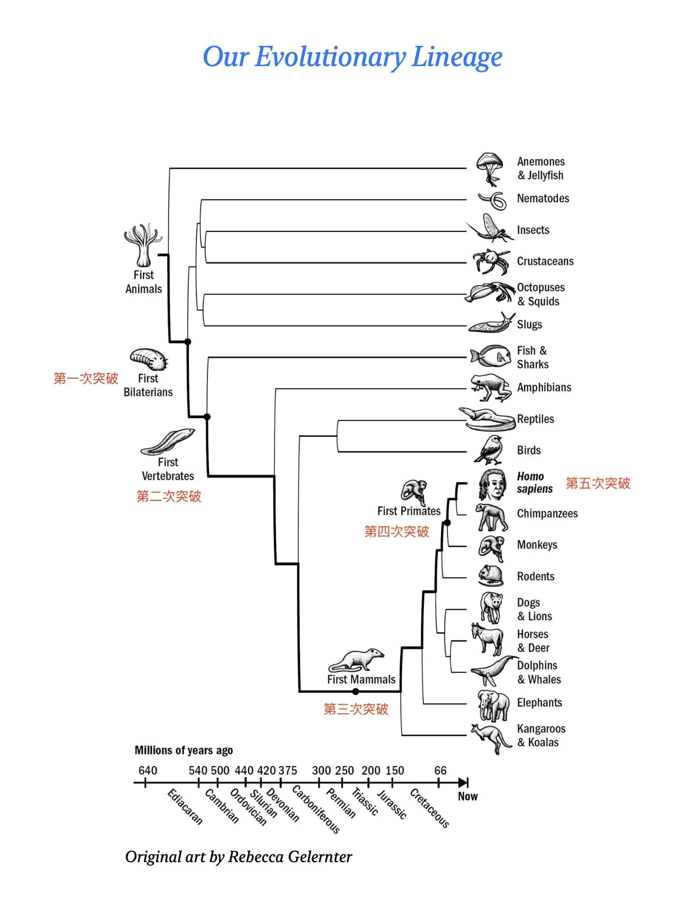 這本「智慧簡史」我認為可以和Yuval Harari 的《人類大歷史》比肩,從地球生物視角縱覽了智慧的演化,全書建立一個描述生物大腦進化的新框架,作者稱其為「五次突破」,這對現在AI與具身智慧的研究有巨大的參考價值。