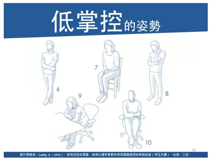 在 Amy 的研究當中發現,擺出這些動作的人,都會評價成比較退縮、內向、沒有自信、拘謹、不確定等等。