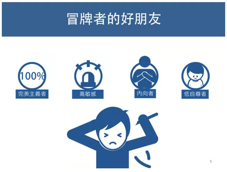 什麼是「冒牌者症候群」? 「冒牌者症候群(以下簡稱冒牌者)是 1978 年由臨床心理學家 Pauline R. Clance 和 Suzanne A. Imes 提出的一種現象,指一些成就高的人害怕被人認為是冒牌者。