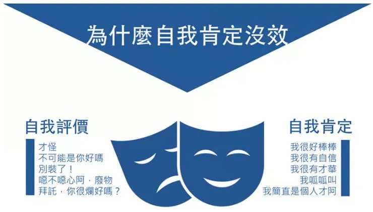 坊間很多教大家「愛自己」的書,大多是走「大腦認知」路線的,但我們的大腦很聰(ㄨㄢˊ)明(ㄍㄨˋ),當你越是嘗試肯定自己「我很好、我很棒、我呱呱叫!」(什麼鬼~)的時候,就越容易被反噬:「才怪!」、「別裝了!」、「噁心!」、「拜託,你很爛好嗎?」