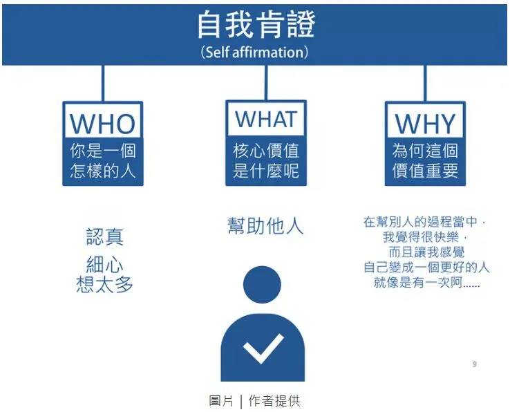 自我肯證 第一個方式是「自我肯證」(Self affirmation),別搞混囉,它並不是傳統那種勵志的「自我肯定」(大家說好不好~好~凍算!凍算!)而是「找到自己的核心價值」。