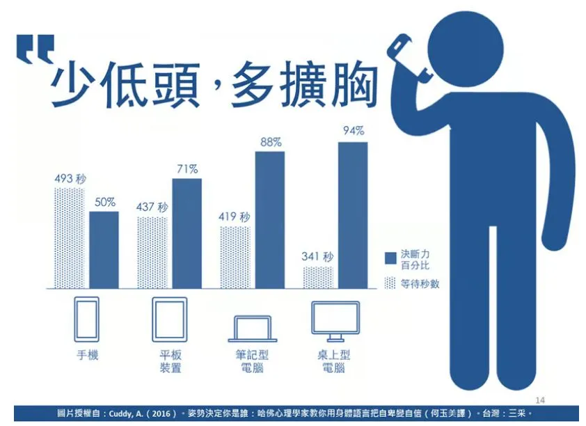 實際上,在做出這些動作之後(甚至根本不用做,只要腦袋裡面想像),持續 2 到 6 分鐘左右的時間,也會讓人有比較有權力的感覺,做出比較自主的決定[8]。