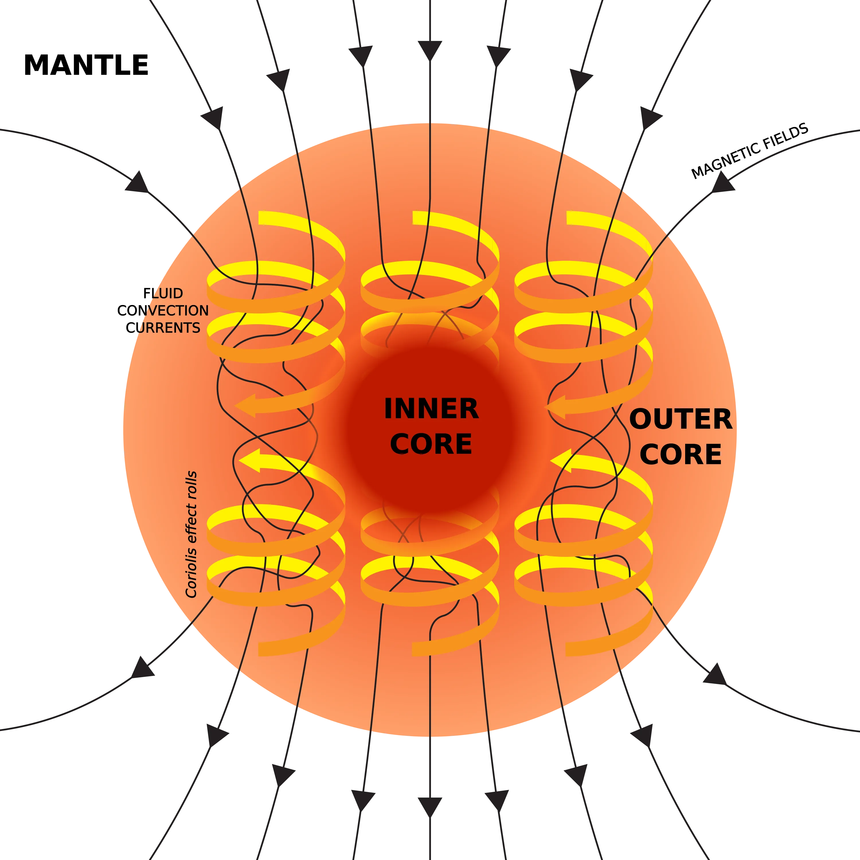 地球磁場是由於地球外核中熔融鐵、鎳的對流以及整個行星自轉的科里奧利力作用造成的。由於地球內部的熱能由核衰變造成,越往地球內部溫度愈熱,外部較涼,因此基本上地球內部會有熱對流產生,也就有物質的傳遞,但鐵鎳合金的成份會隨著溫度的改變而改變,因此它的化學成份也有變化,也會造成對流的現象。