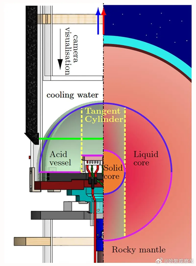 研究人員為了解釋這種差異,構建了一個可以同時捕捉對流、旋轉和磁力的實驗。通過這種方式計算類地條件下的電磁力和旋轉力,作者發現,至少10%的液體以類似地核中的循環模式流動;但在解釋不能僅用旋轉來描述的對流時,必須考慮磁場極性分量驅動極地和赤道地區之間產生的感應電流。