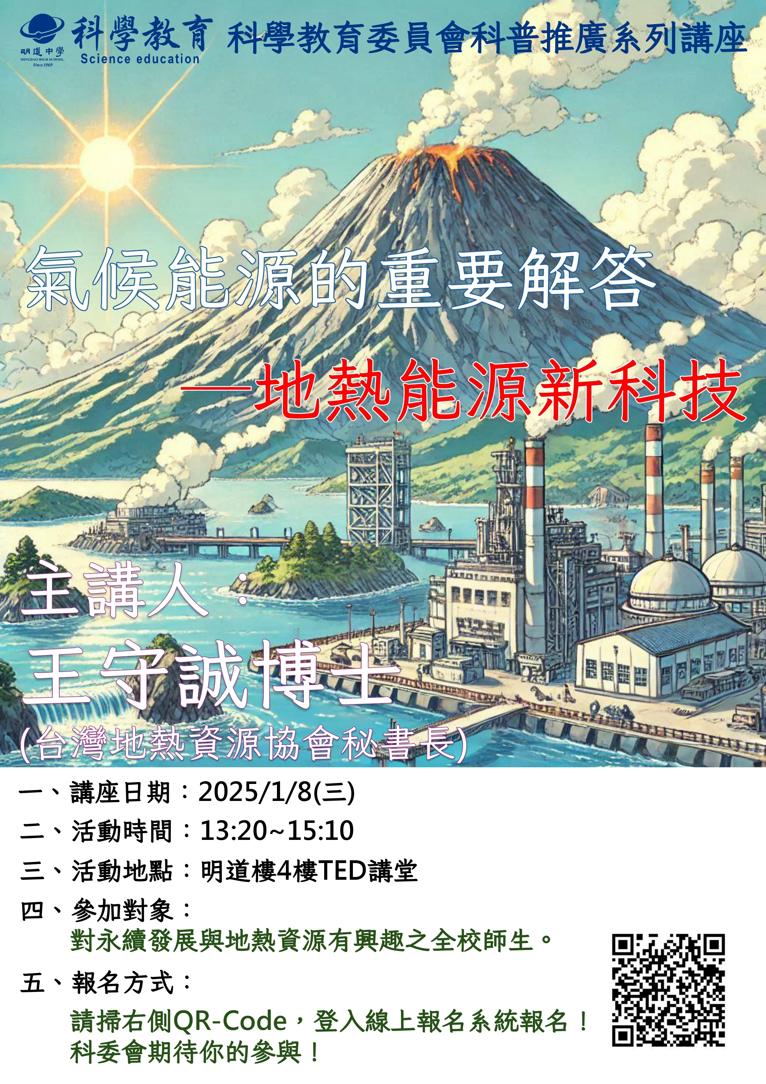 為推廣科學知識並激發高中學生對永續發展及綠色能源的興趣,科學教育委員會特此誠邀王守誠博士,進行一場以「永續發展目標與綠色能源:台灣地熱資源的探索與應用」為主題的科普講座。王博士在地熱研究領域的專業背景及對台灣地熱資源發展的深入瞭解,對本校師生而言,將是一份珍貴的學習資源。