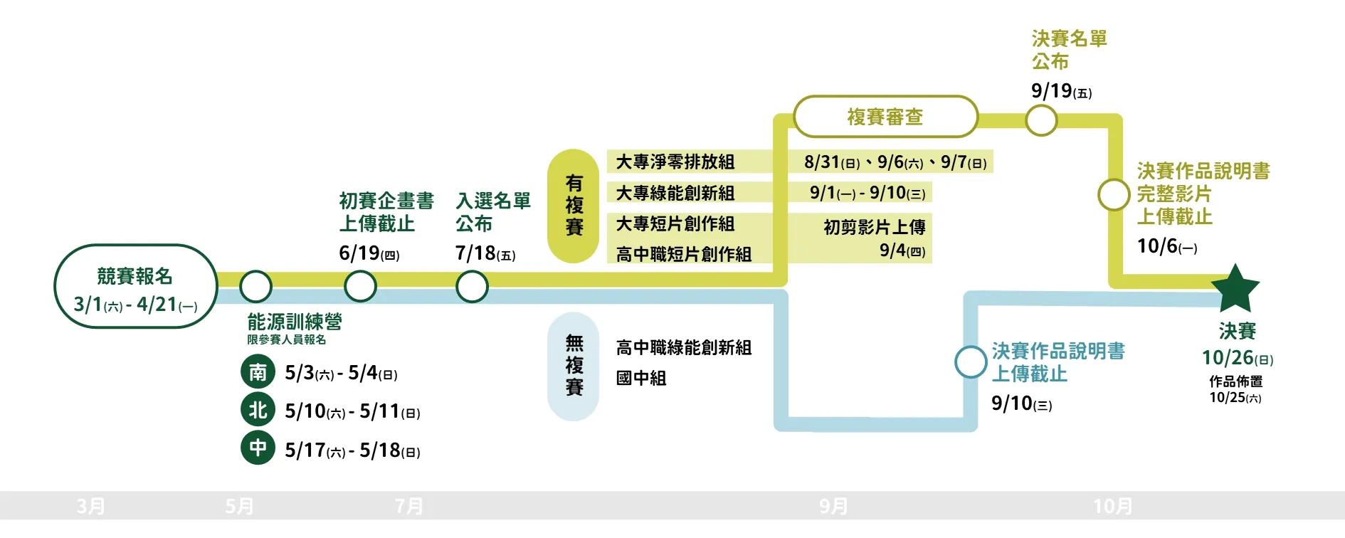 大專組:淨零排放組、綠能創新組、短片創作組 高中職組:短片創作組、綠能創新組 國中組:不分組