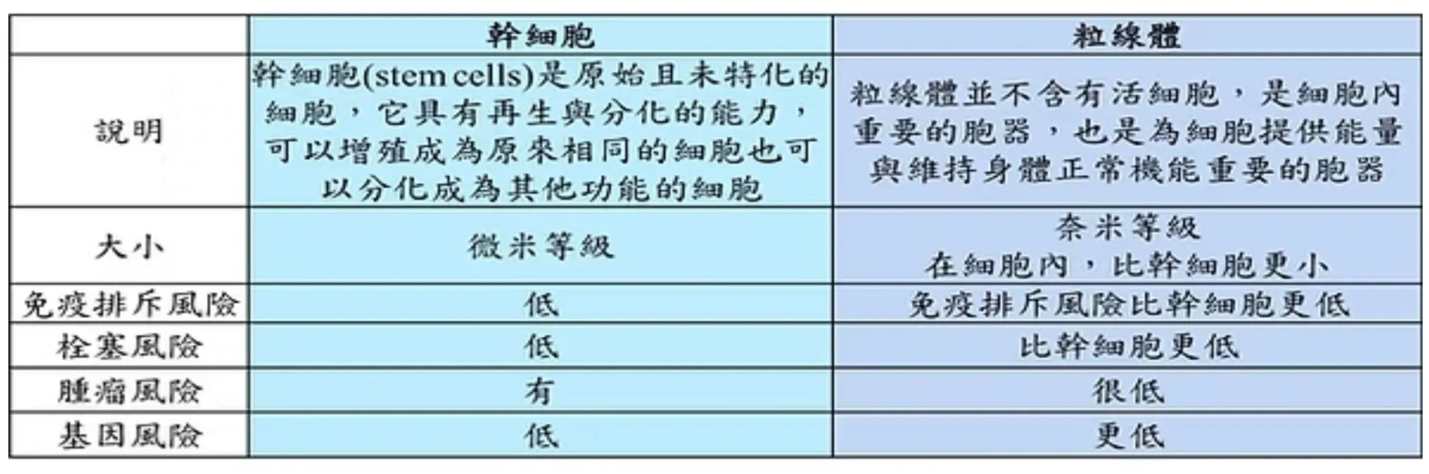 粒線體再生療法可視為無細胞療法(cell-free therapy),粒線體與幹細胞相比,基因、血管栓塞、免疫排斥和腫瘤形成的風險更低。