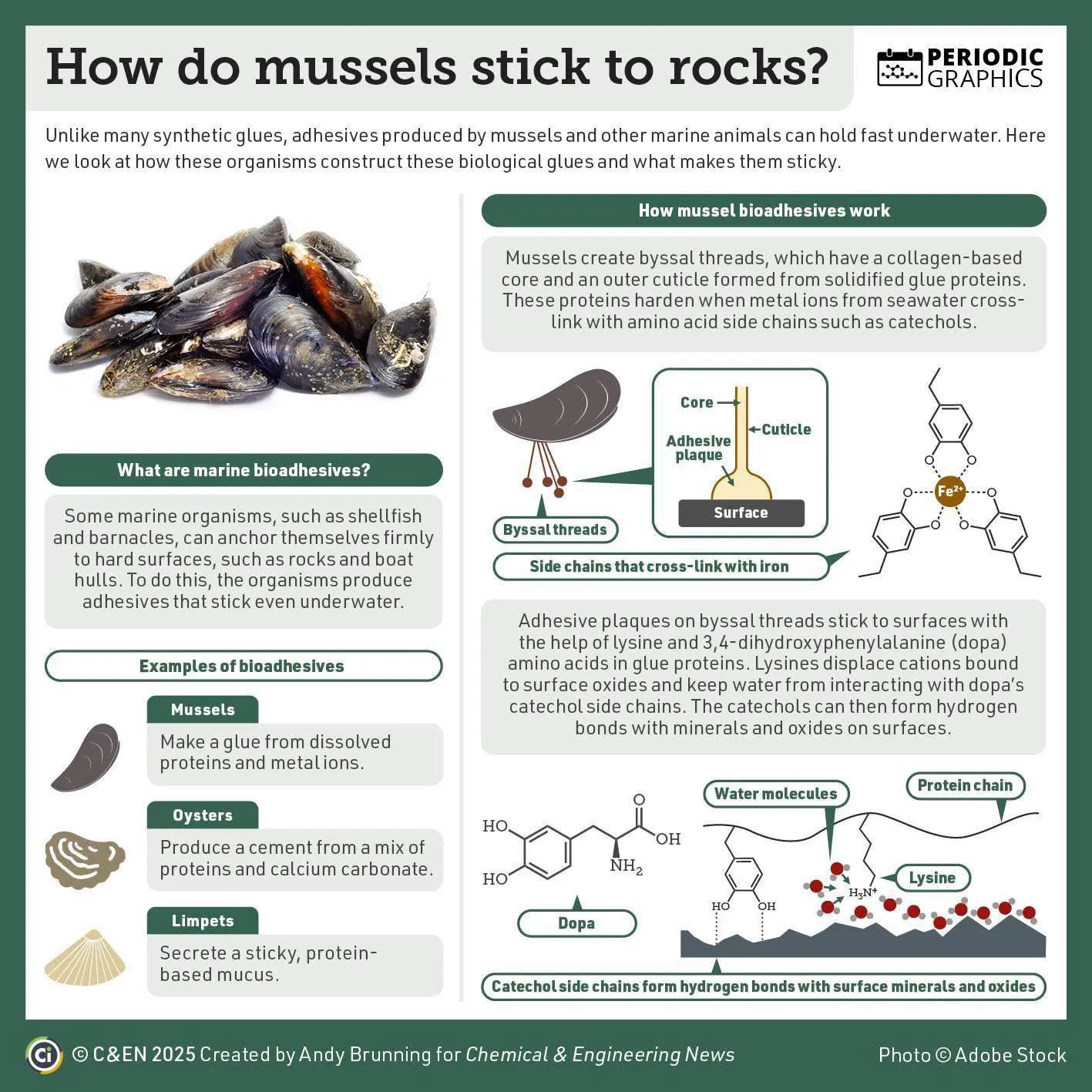在這個過程中,兩種關鍵的胺基酸發揮了重要作用:賴氨酸(lysine)和3,4-二羥基苯丙氨酸(dopa)。Dopa分子中的兒茶酚(catechol)側鏈能與表面的礦物和氧化物形成氫鍵,這種化學鍵在潮濕環境中依然穩定。同時,賴氨酸則幫助dopa將鐵離子從表面氧化物中置換出來,進一步增強黏附力。這種與鐵交聯的化學作用,讓淡菜的足絲能牢牢抓住岩石表面,即使面對洶湧的海浪也不會脫落。
