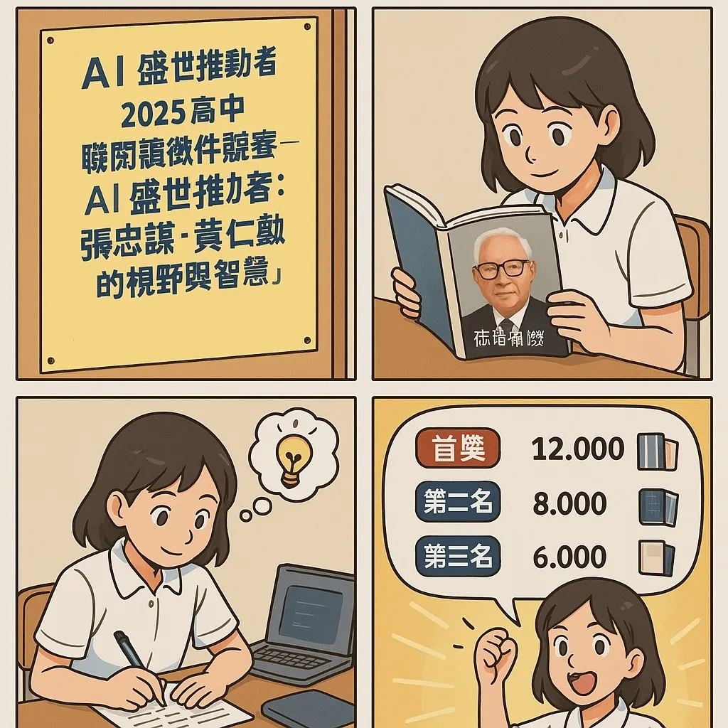 天下文化【2025高中職閱讀徵件競賽─AI盛世推動者:張忠謀、黃仁勳的視野與智慧】。 2.活動目的: