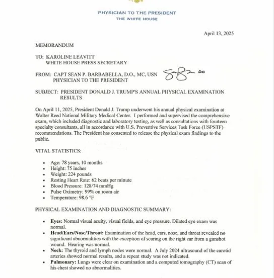 2025年4月,美國總統唐納・川普進行了年度身體檢查,當時他已年屆78歲10個月。這份由白宮醫師巴巴貝拉上校(Capt. Sean P. Barabbaella)出具的健康報告,不僅是國家領導人健康狀況的縮影,也是一扇難得的窗口,讓我們得以窺見現代醫學界在「長壽策略」上的最高共識。