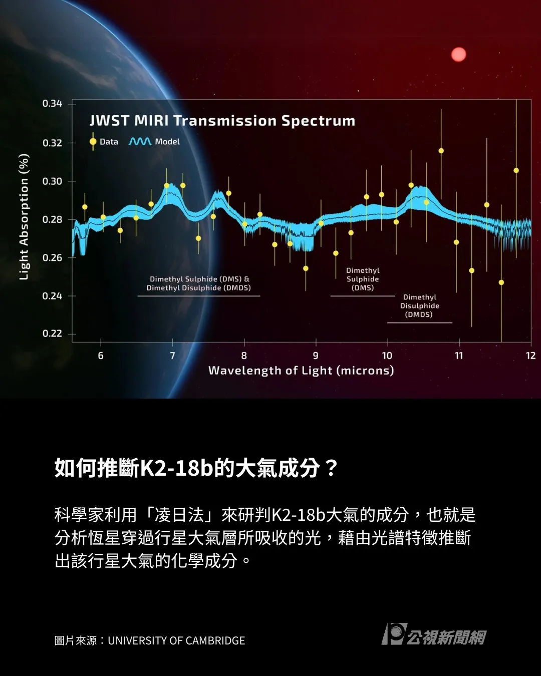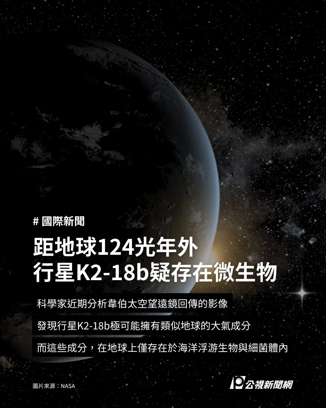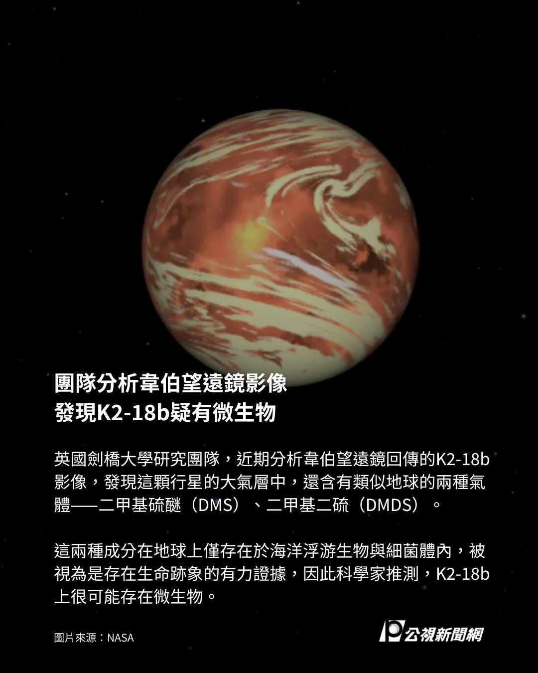 近期科學家分析發現,這顆行星的大氣層中,還含有類似地球的兩種氣體二甲基硫醚、二甲基二硫,這兩種成分在地球上僅存在於海洋浮游生物與細菌體內,因此推測K2-18b上很可能存在微生物。