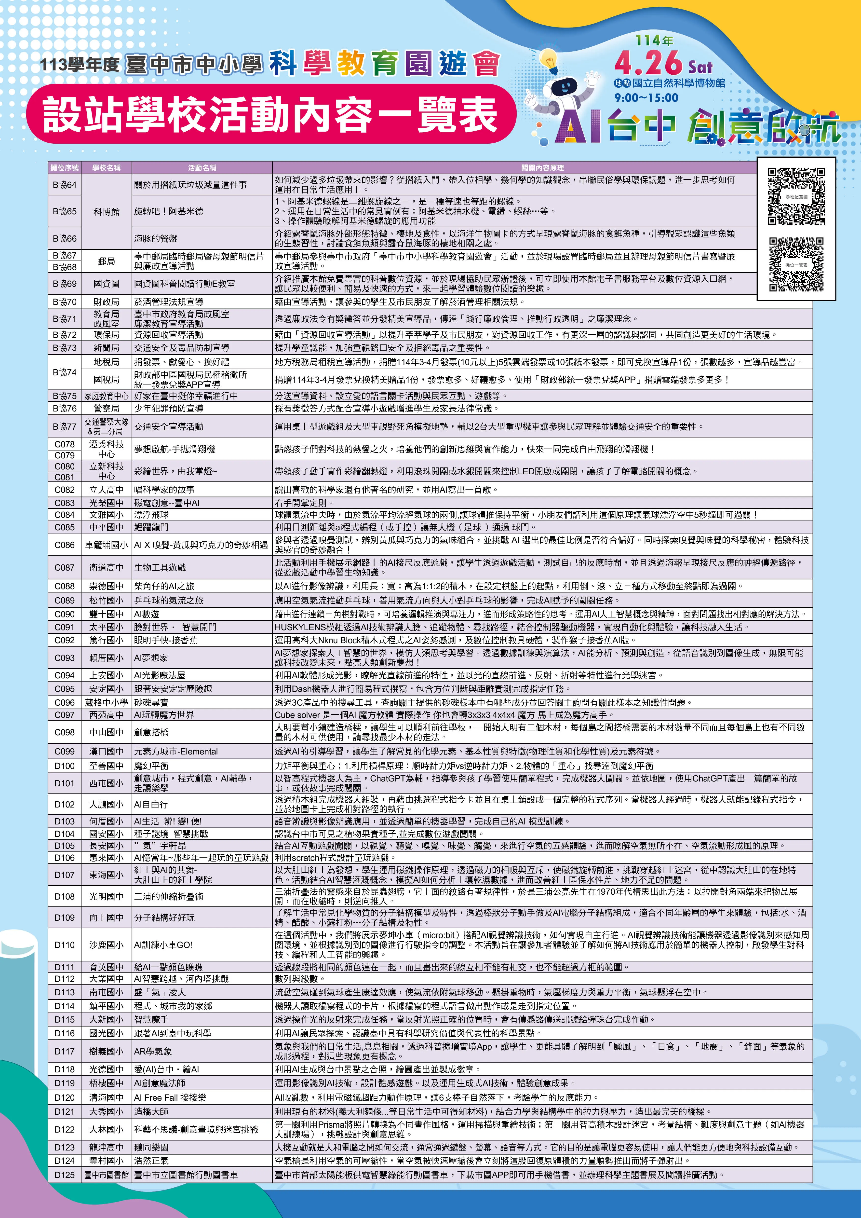 活動日期:114年4月26日(星期六) 活動時間:上午9時至下午3時止 活動地點:國立自然科學博物館