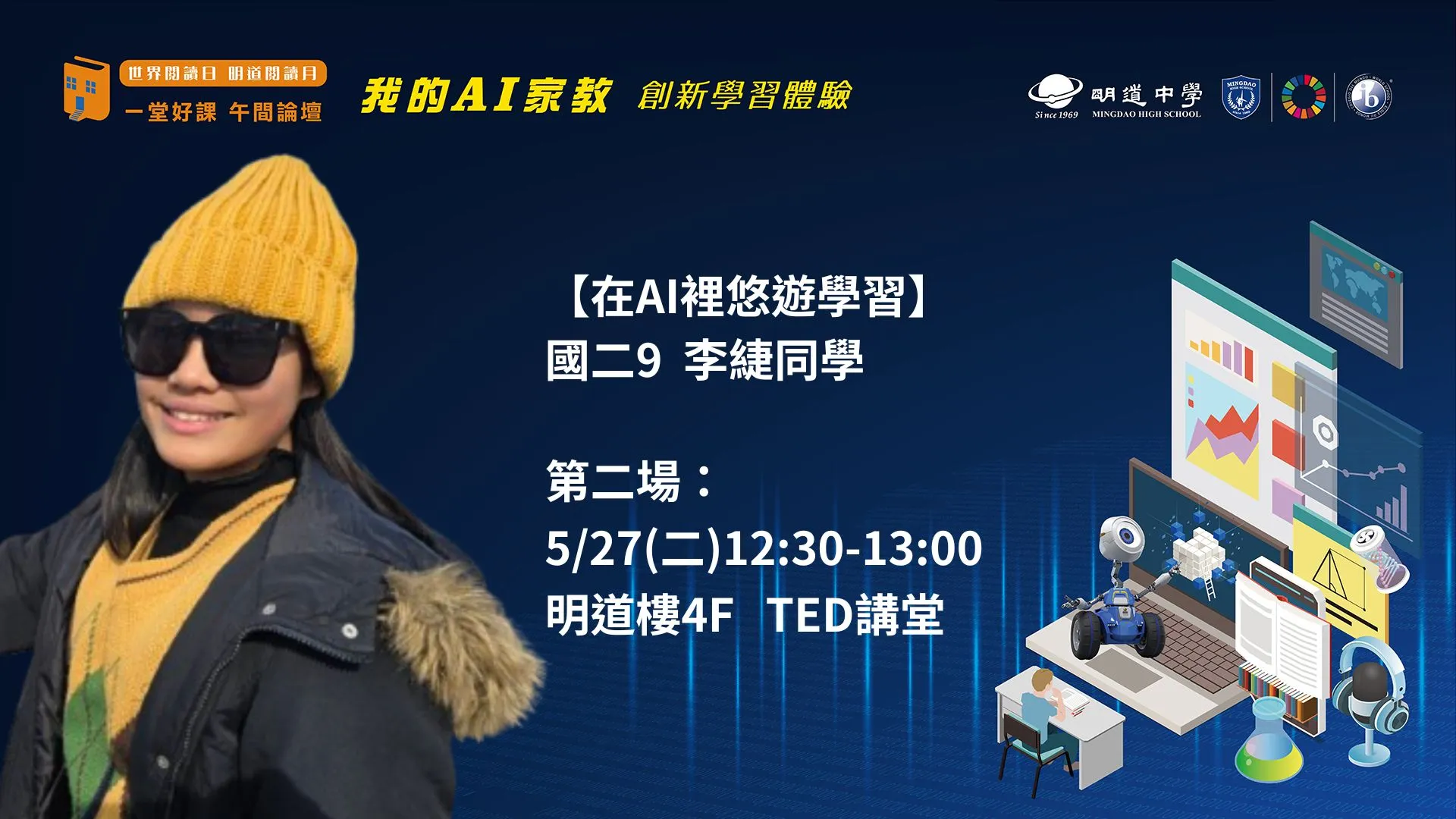 【我的AI家教-創新學習體驗】 「在AI裡悠遊學習」 5/27(二)12:30-13:00 明道樓4F-TED講堂 分享者:國二9 李緁同學
