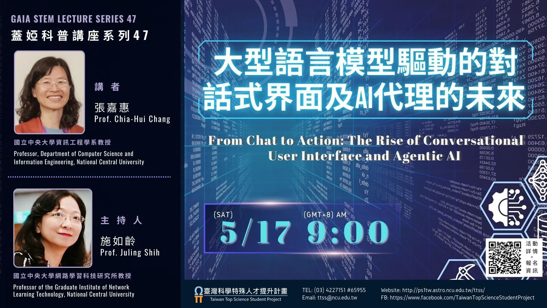 想知道ChatGPT、智能助理、AI代理人背後的前沿技術是什麼嗎?🔍國立中央大學張嘉惠教授將帶你探索大型語言模型(LLMs)如何重塑人機互動,並展望AI代理人的未來可能性!