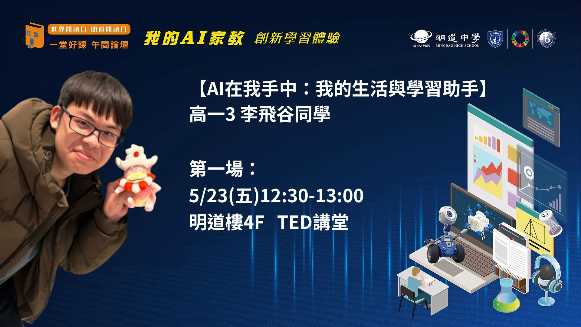 【我的AI家教-創新學習體驗】 「AI在我手中:我的生活與學習助手」 5/23(五)12:30-13:00 明道樓4F-TED講堂 分享者:高一3 李飛谷同學
