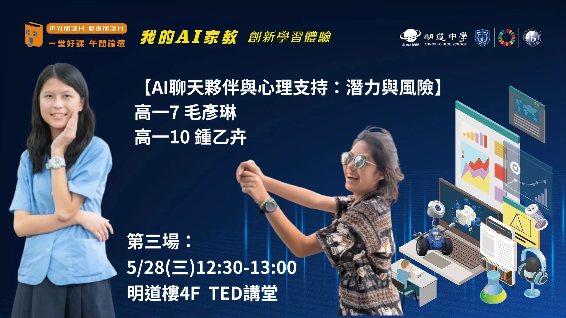 【我的AI家教-創新學習體驗】 「AI聊天夥伴與心理支持:潛力與風險」 5/28(三)12:30-13:00 明道樓4F-TED講堂 分享者:高一7毛彥琳、高一10鍾乙卉