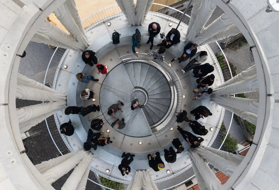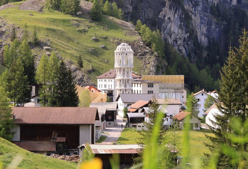 這座塔是由蘇黎世聯邦理工學院的建築師和研究團隊一起打造的,過程用了最新的3D列印技術,用特製混凝土一層一層列印出來,不用傳統模板,也沒有用水泥黏死,而是用螺絲和鋼索固定,未來拆掉搬走也不會太困難。塔的設計靈感來自當地的糖果歷史,也像是在向這個快要沒人住的小村莊致敬。現在塔裡不只可以參觀,未來還會舉辦表演活動,最上層還有一個圓頂劇場。