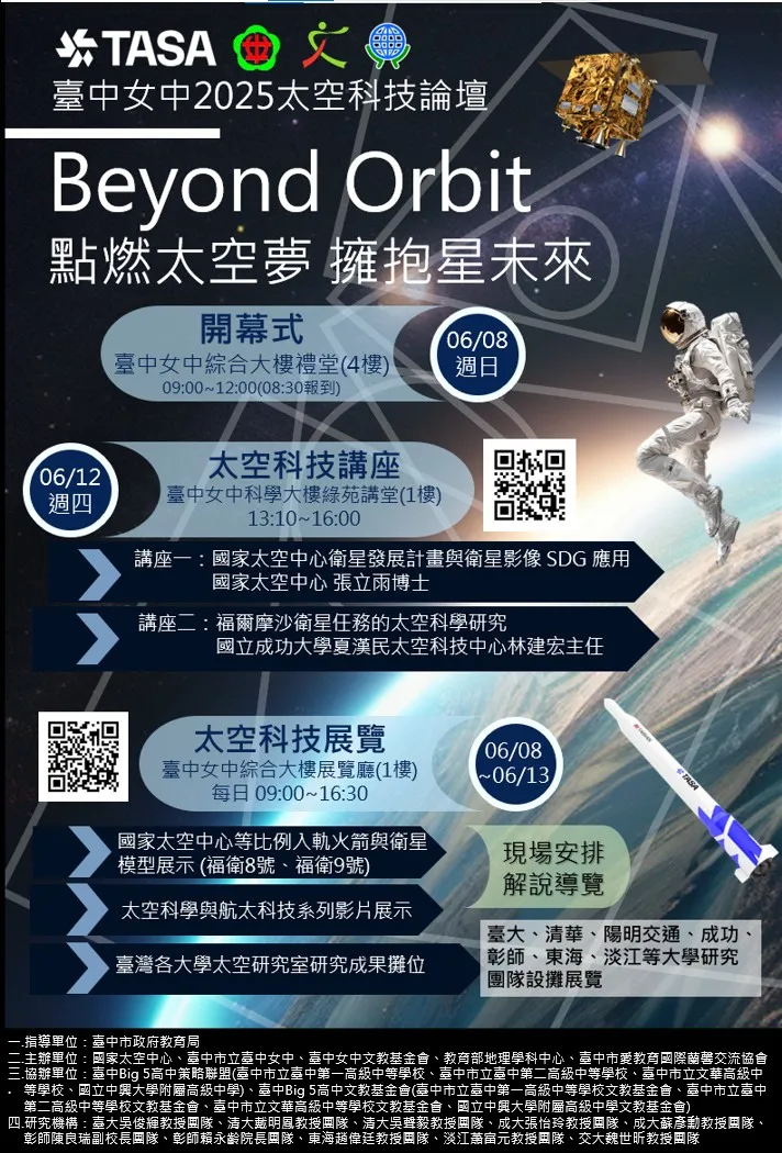 由臺中女中與國家太空中心聯手主辦的─ 🔭《Beyond Orbit:臺中女中2025太空論壇》 將於6/8(日)~6/13(五)盛大展開!🎉