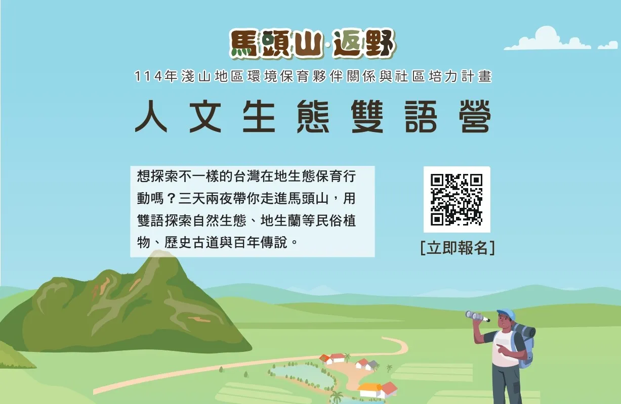 📅 活動時間:2025年7月16日(三)~7月18日(五)|3天2夜深度體驗 📍 活動地點:馬頭山地區(詳細地點將另行通知) 🎯 招生對象:全國高中職 & 大專院校在學學生 🧠 教學特色:雙語互動式環境教育 × 在地文化導覽 × 永續保育實踐