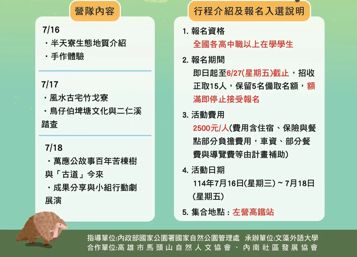 對環境保育有熱情? 對在地文化有興趣? 想用英語親近自然,深入台灣淺山人文與生態? 這場由文藻外語大學與國家自然公園管理處攜手推出的 「人文生態雙語營」 你絕不能錯過!