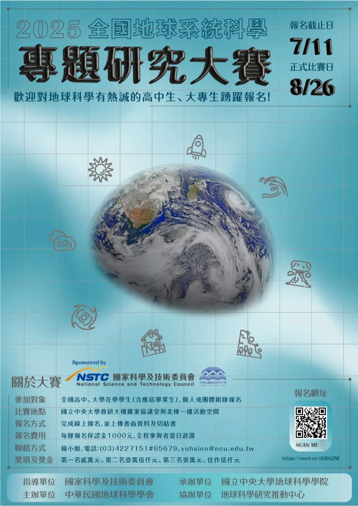 由國立中央大學地球科學學院承辦的「2025 全國地球系統科學專題研究大賽(高中組)」,致力於鼓勵高中生投入地球科學領域的探究與實作,從「自主學習 → 問題分析 → 創新發表」一步步培養學術研究力與跨領域合作力!