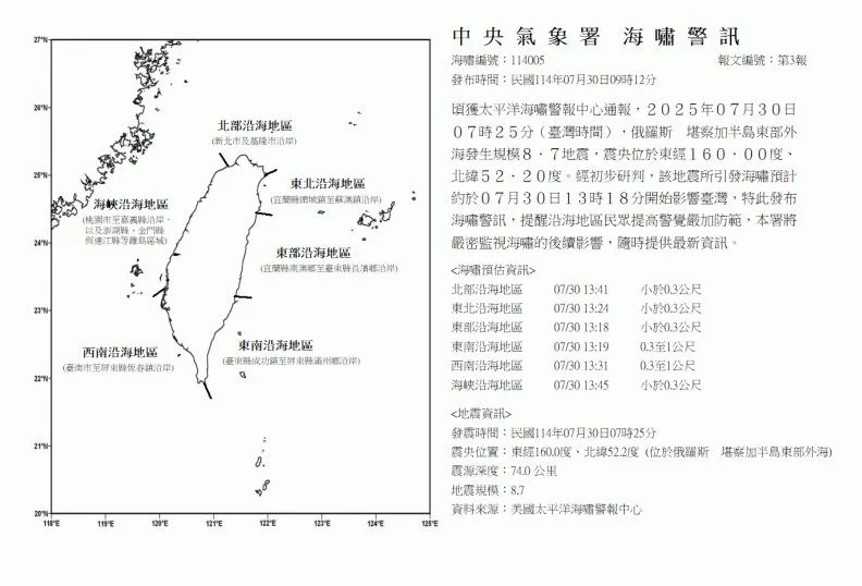 - 中央氣象署海嘯警報中心資料(2025年7月30日)