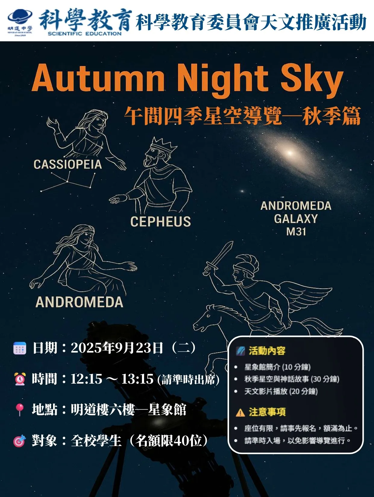 📢 歡迎同學們踴躍報名,一同在午間時光感受秋季星空的魅力!