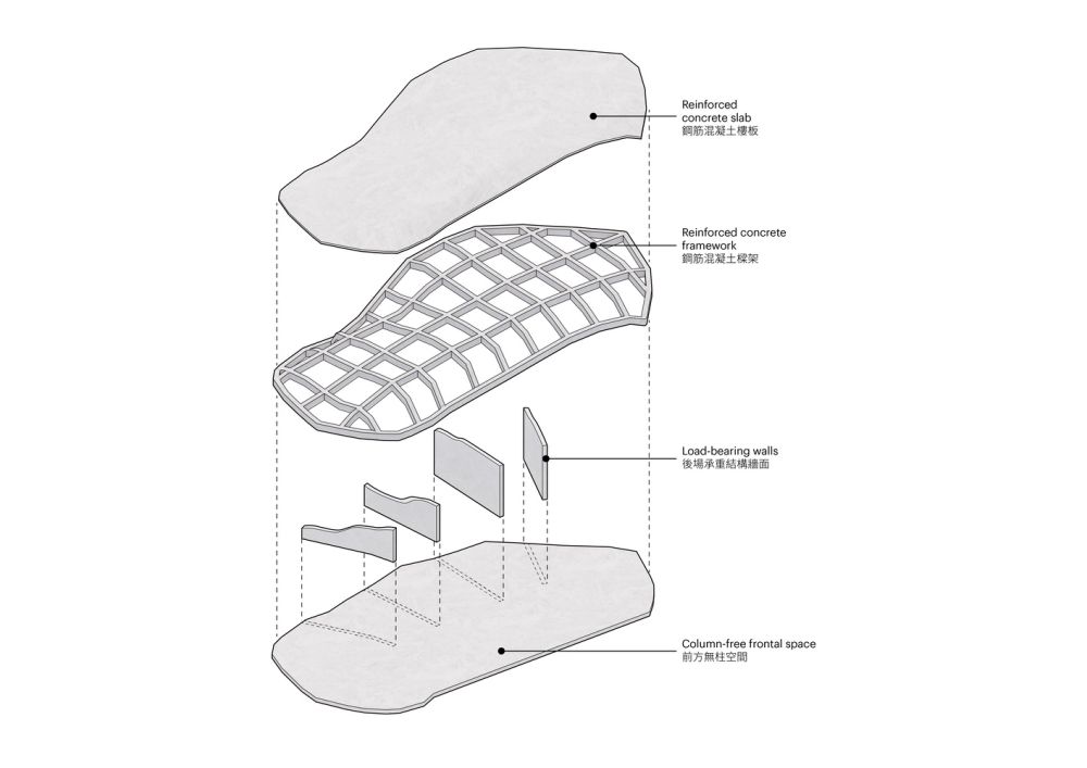 建築將以混凝土打造,並使用拆除建築所產生的再生骨材,預期這些材料最終會被苔蘚與小型植物覆蓋,以進一步融入自然景觀,「在我們的設計中,人造元素的形狀來自周圍的自然,就像場地的自然延伸,而非外來之物。我們的目標從不是將建築強加於景觀之上,而是讓它從自然條件中自然生成,打破筆直線條的單調。」MVRDV 共同創辦人 Winy Maas 說道。