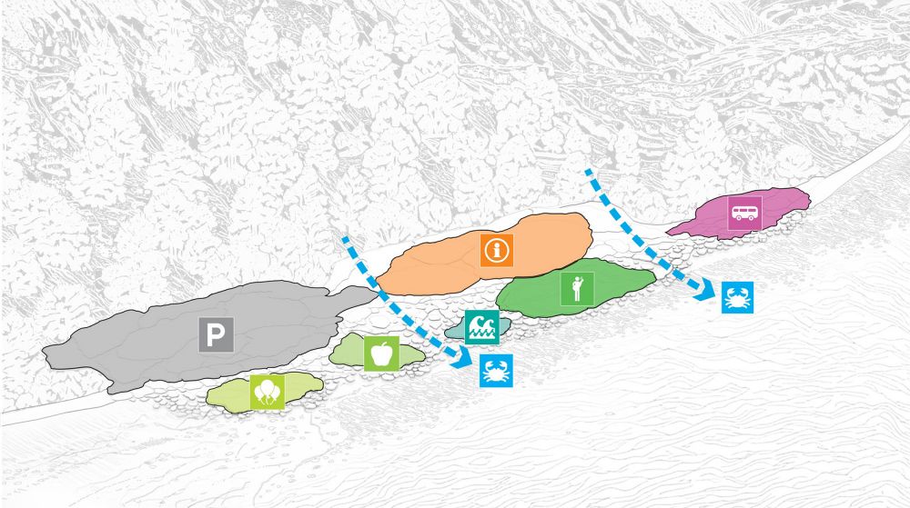 根據 MVRDV 所述,所有新建設將限制於既有開發區域內,以避免干擾自然景觀。鋪面設計中融入裂縫,具備被動排水與保護緩衝功能,以管理雨水並減少颱風損害。這些裂縫亦讓植物扎根,並為小型動物在森林與海岸之間移動提供通道。景觀設計上,轉譯大自然的排列,依地勢自然變化:靠近森林處栽種高大、密集的原生植物,靠近海岸則是改以低矮的植被。