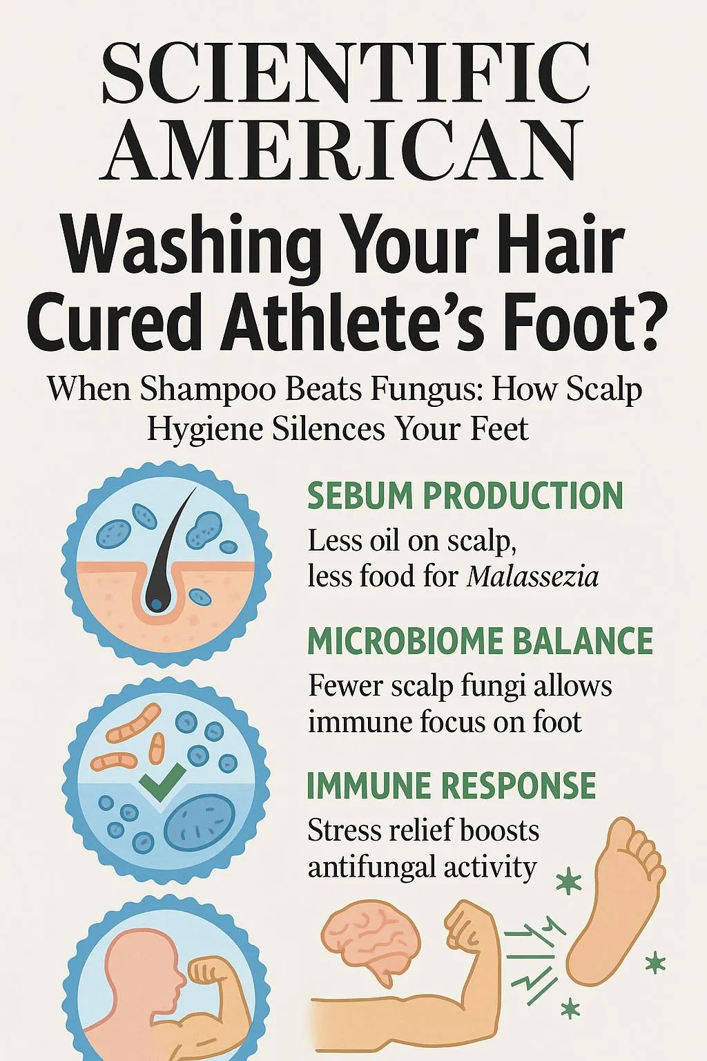 但當你洗頭讓頭皮真菌減少,全身的免疫警報就能冷靜下來,重新聚焦於真正的威脅——那雙腳趾間的皮癬菌。