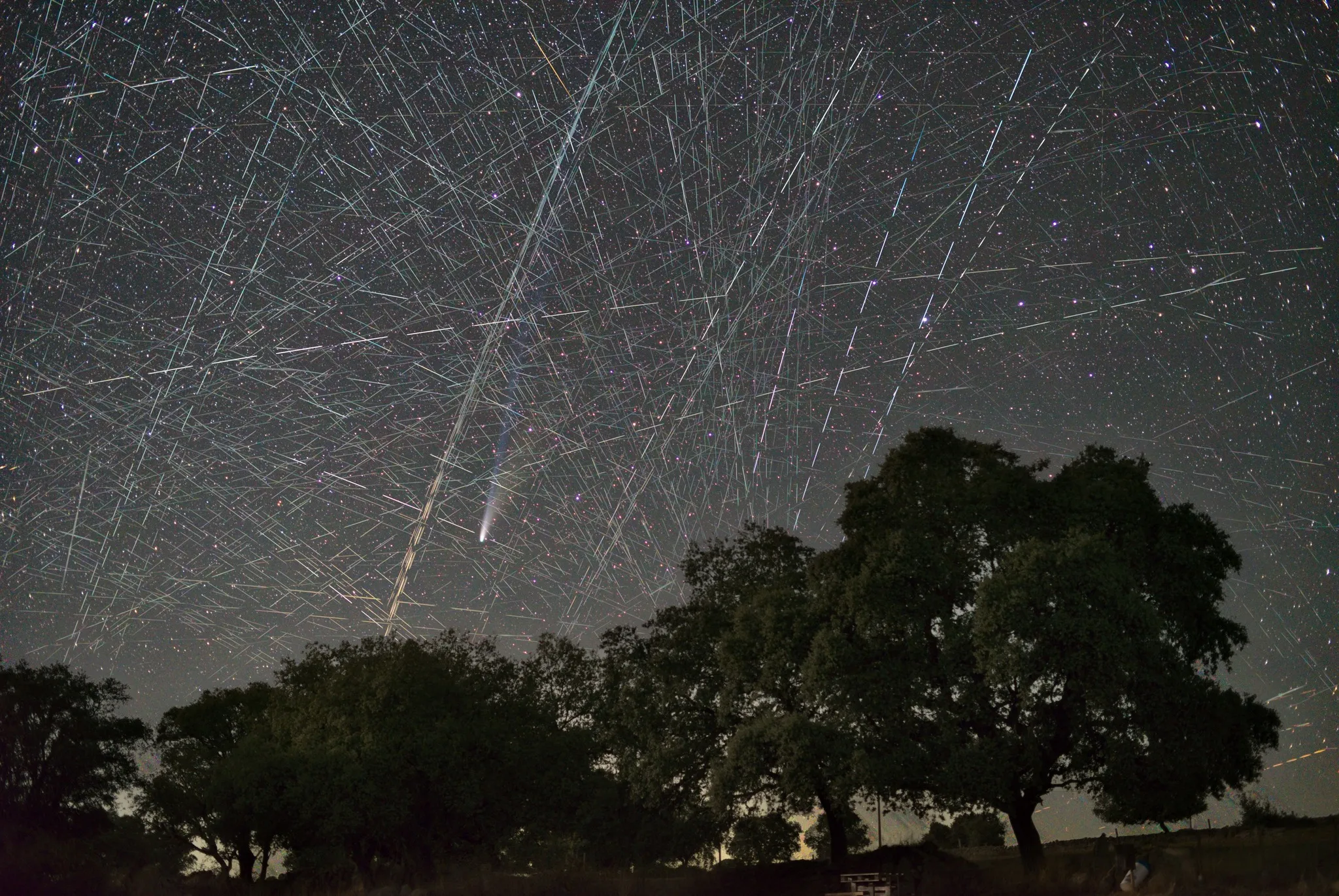 在照片中央,萊蒙彗星仍以柔弱的光線穿過密集的衛星軌跡——