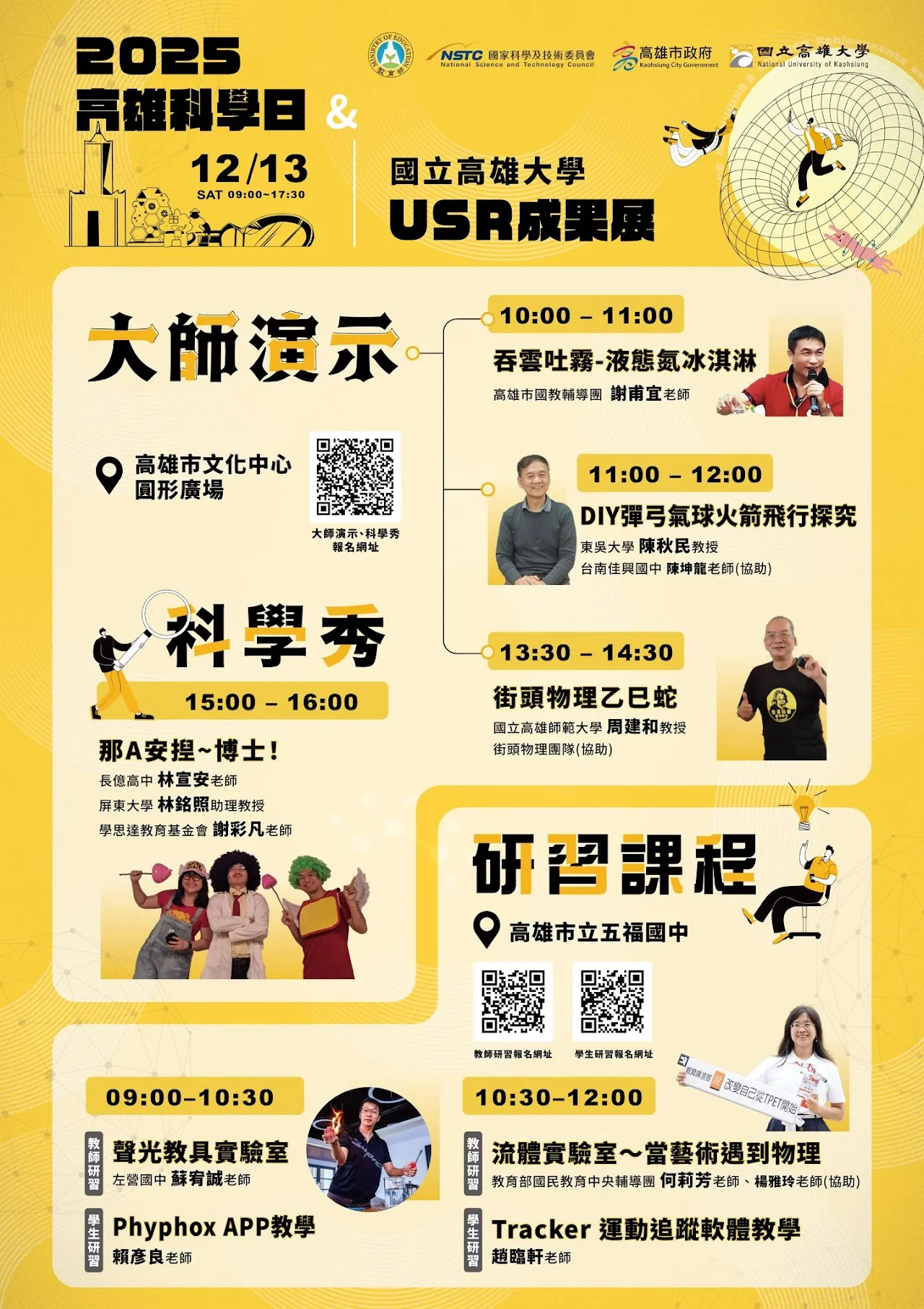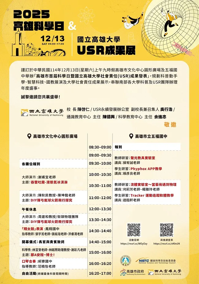 🎉 2025高雄科學日 x 國立高雄大學USR成果展 盛大登場! 12月13日(六)我們在 高雄市文化中心 與 五福國中 等你一起探索科學的魅力!