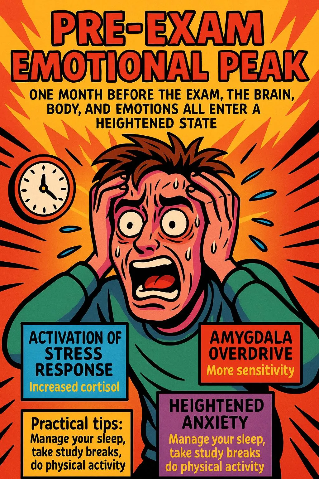Guyer等人(2016)的青少年壓力研究指出:在高壓時期,杏仁核對負面刺激的反應比平時上升40–60%。這就是為什麼考生會特別容易: