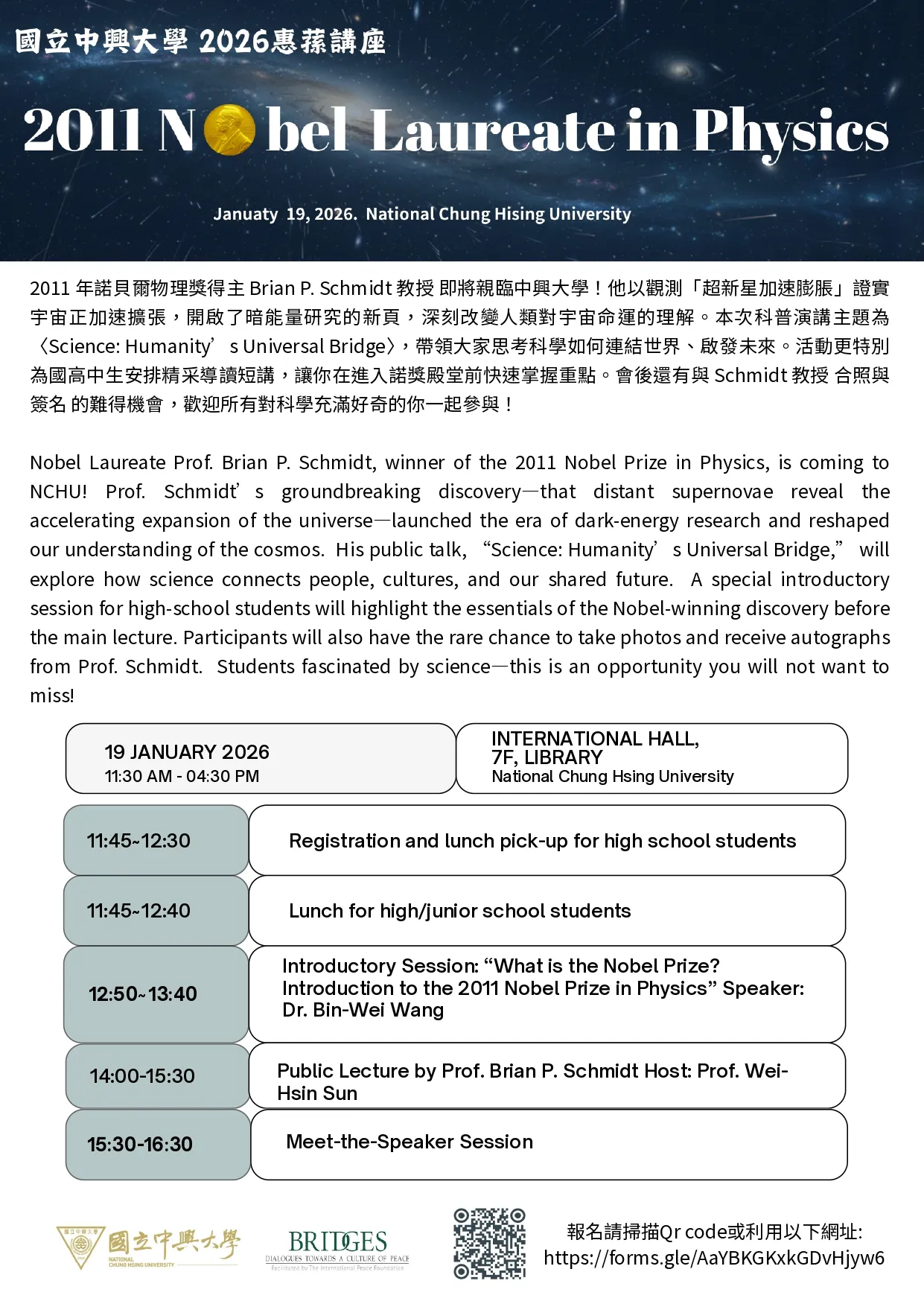 📅 時間:115年1月19日(星期一)11:30–16:30 📍 地點:國立中興大學圖書館 7 樓國際會議廳 🗣️ 講者:Brian P. Schmidt(2011年諾貝爾物理學獎得主)