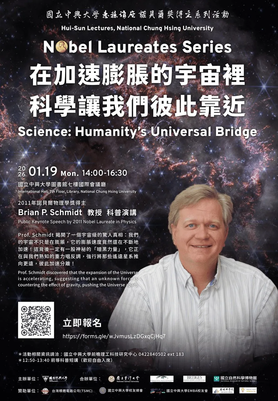 Nobel Laureate Prof. Brian P. Schmidt, winner of the 2011 Nobel Prize in Physics, is coming to NCHU! Prof. Schmidt’sgroundbreaking discovery—that distant supernovae reveal the accelerating expansion of the universe—launched the era of dark-energy research and reshaped our understanding of the cosmos.His public talk, “Science: Humanity’s Universal Bridge,” will explore how science connects people, cultures, and our shared future. A special introductory session for high-school students will highlight the essentials of the Nobel-winning discovery before the main lecture. Participants will also have the rare chance to take photos and receive autographs from Prof. Schmidt. Students fascinated by science—this is an opportunity you will not want to miss!