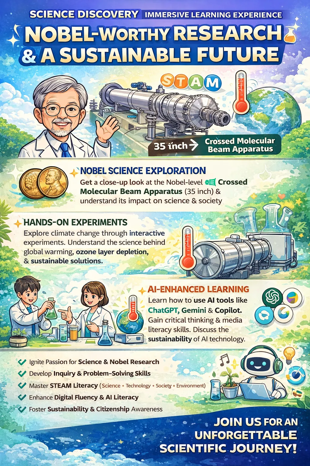 ✔ 激發對科學與諾貝爾級研究的興趣 ✔ 培養探究實作與問題解決能力 ✔ 強化STSE(科學×科技×社會×環境(])素養 ✔ 提升數位與AI素養,連結108課綱核心能力 ✔ 建立永續、減碳與公民責任意識