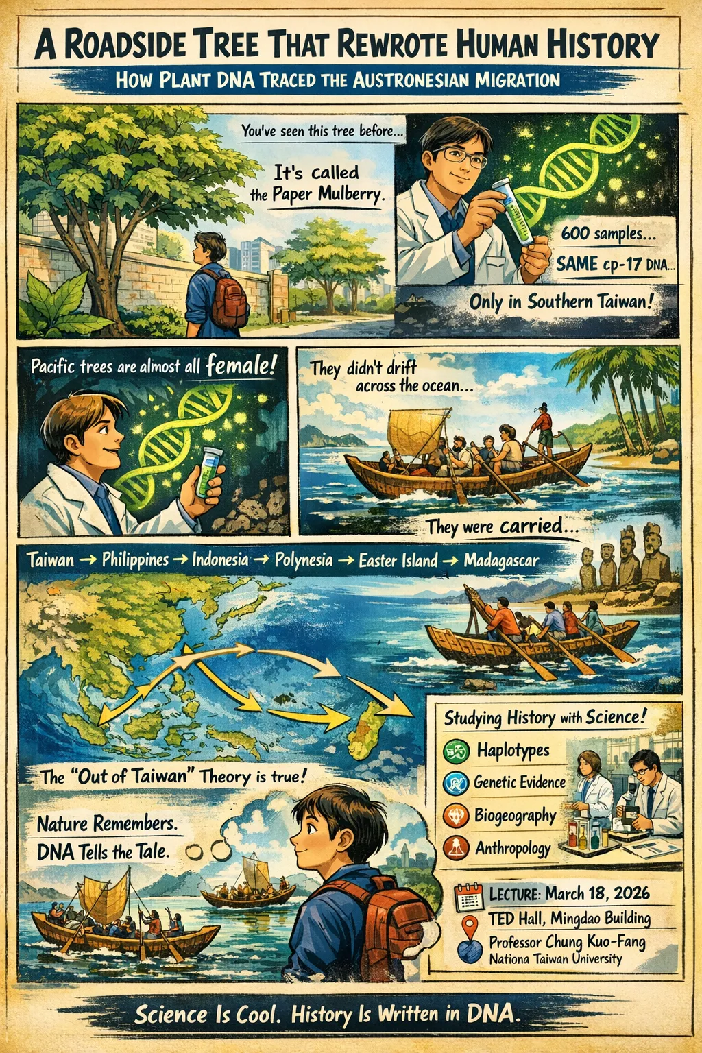 ✔ 什麼是基因單倍型(Haplotype)? ✔ 為什麼起源地通常擁有最高基因多樣性? ✔ 為什麼太平洋構樹幾乎全是雌性? ✔ 科學家如何花 7 年、橫跨半個地球,收集 600 個樣本? ✔ 一篇研究如何登上國際頂尖期刊?