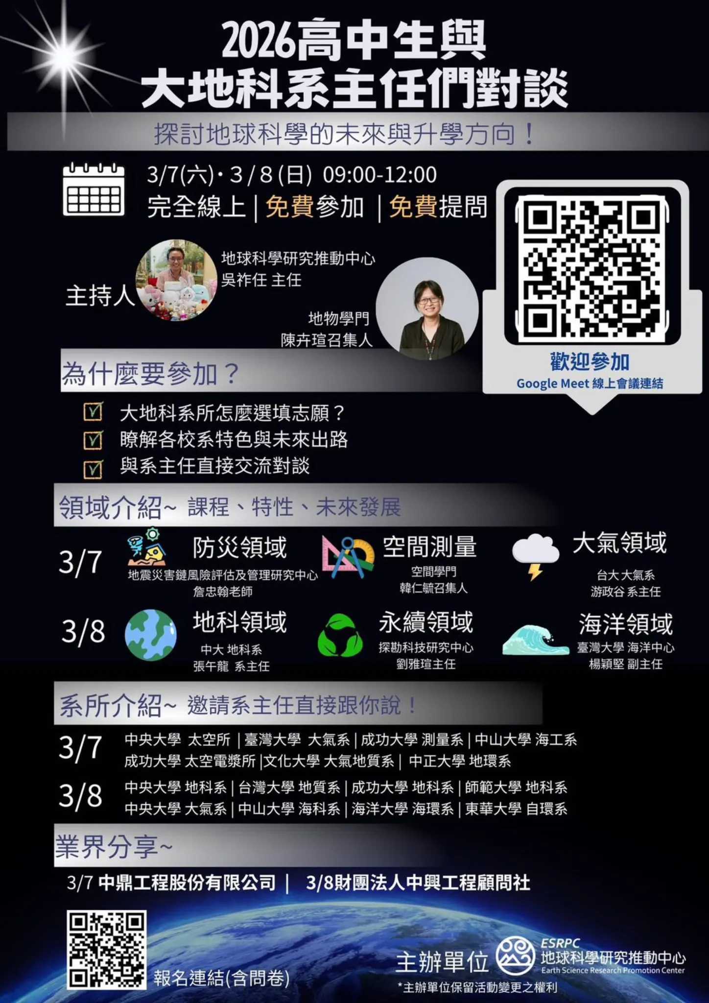 🔹 大地科學領域介紹 防災、大氣、地質、海洋、空間測量、永續發展等 🔹 系所介紹與特色說明 由各大學系主任親自說明課程內容、研究方向與未來發展 🔹 業界分享 邀請相關產業單位介紹地科人才於工程、防災、永續與環境治理中的角色 🔹 即時Q&A交流 學生可直接向系主任提問,獲得第一手資訊